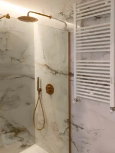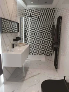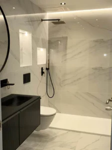 Baño renovado con diseño moderno y materiales de alta calidad, pensado para ofrecer confort, funcionalidad y una estética elegante en la vivienda en Oviedo.