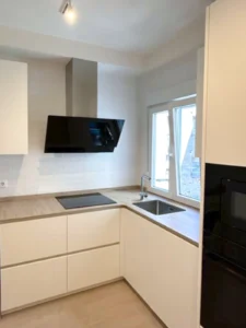 Cocina moderna con acabados de alta calidad, diseño contemporáneo y distribución optimizada en la reforma integral del piso en Gijón.